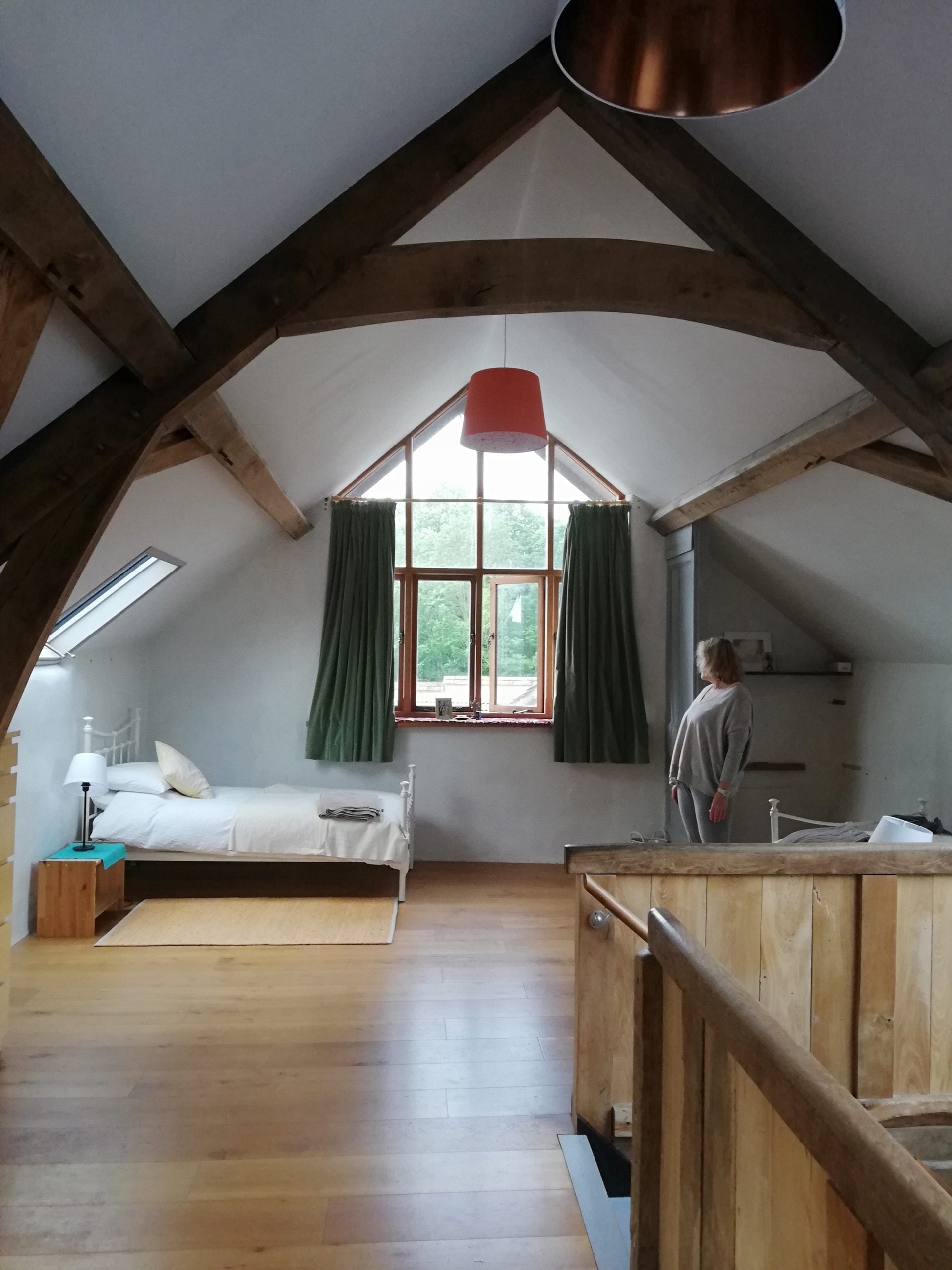 Santosha Loft – traditional oak framed with wooden floor and ensuite bathroom. Sleeps up to 4. On public retreats sleeps three; one shared bathroom (bath with shower attachment).