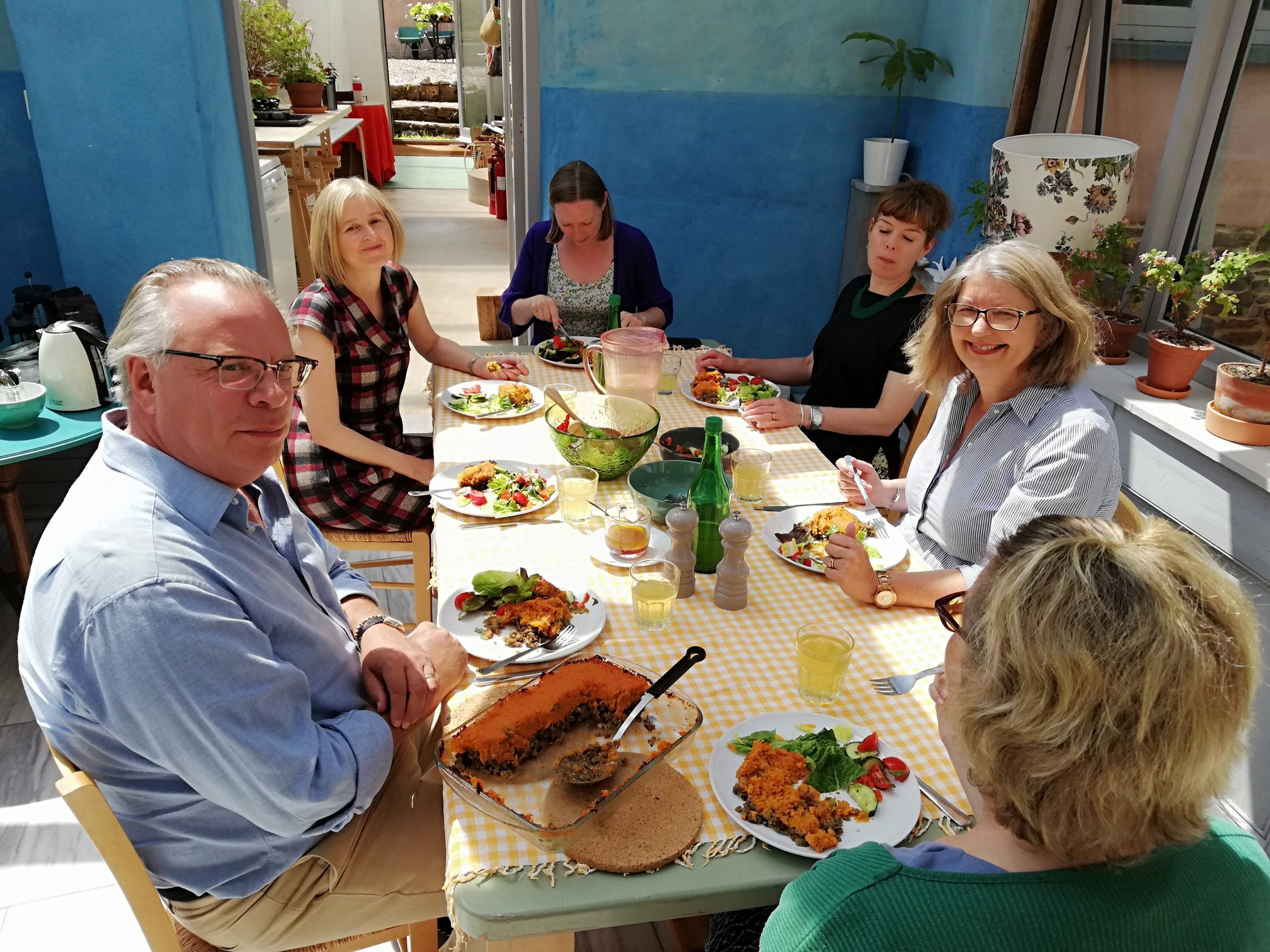 Eat delicious home-cooked vegan meals, with local and homegrown produce in season, round the table together