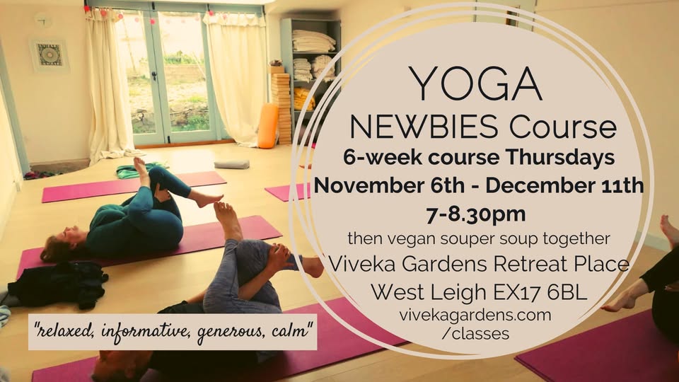 Experienced, kind teacher for friendly sessions in real life in the lovely yoga studio at Viveka Gardens Retreat Place in Mid Devon.