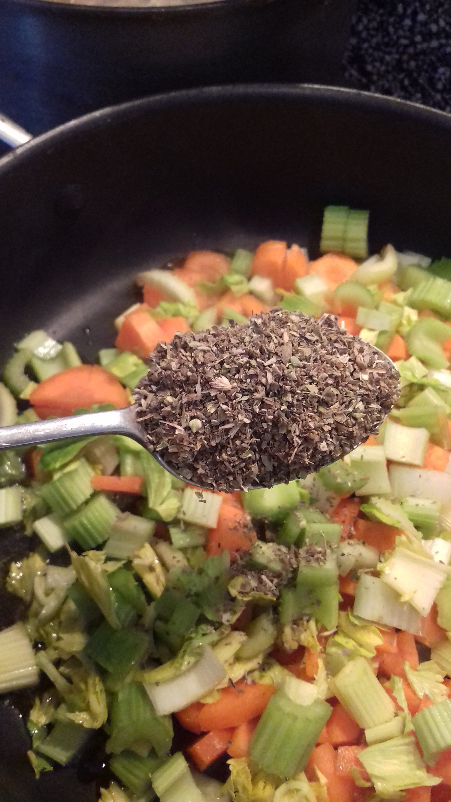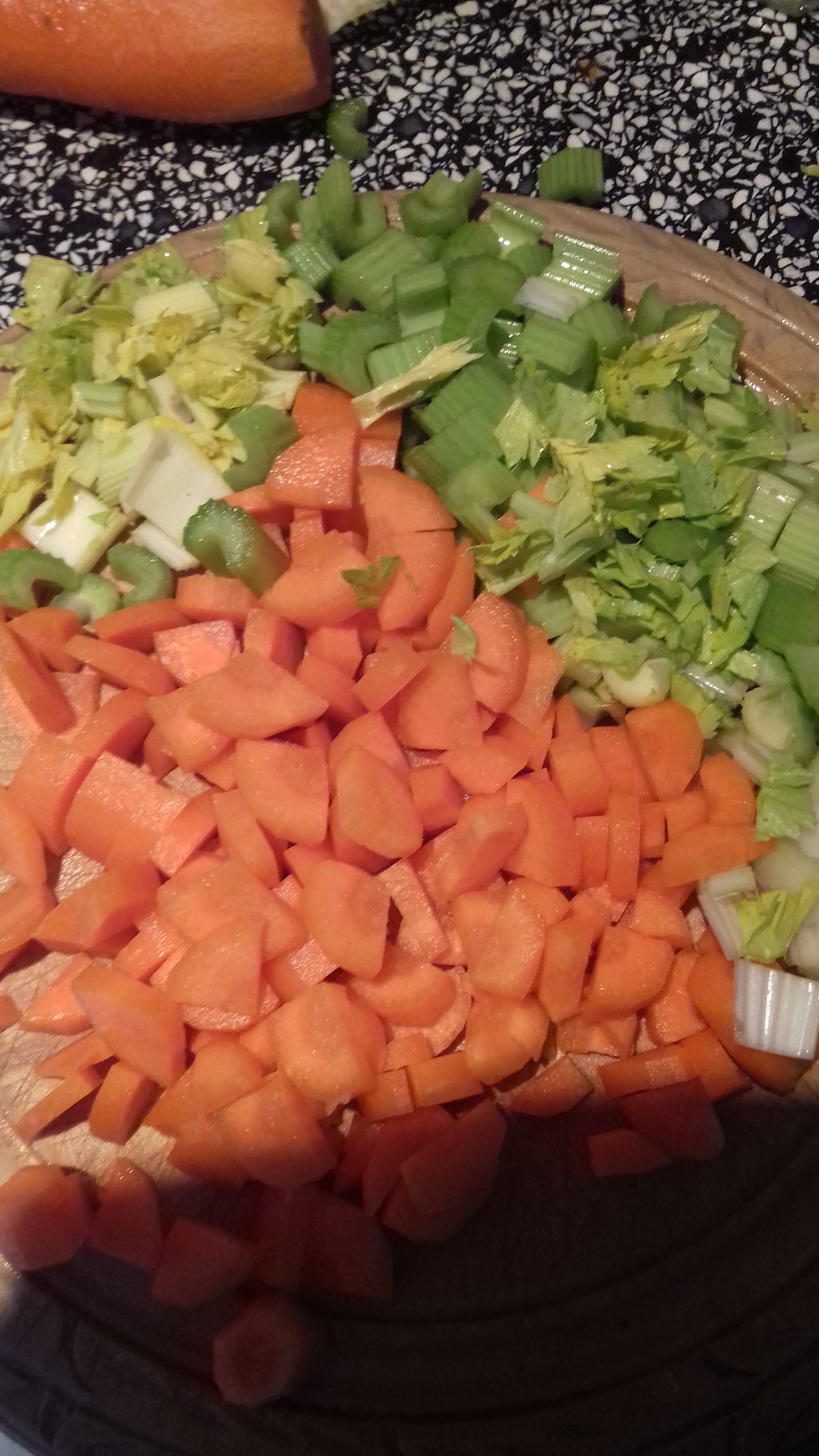 I’ve given indication of how to chop celery and carrot. Experienced cooks will understand this but for newer cooks the reason is that carrot is denser and so needs to be sliced smaller. This way you won’t end up with hard carrots and soggy celery but a pleasing consistent texture. I hope that makes sense.