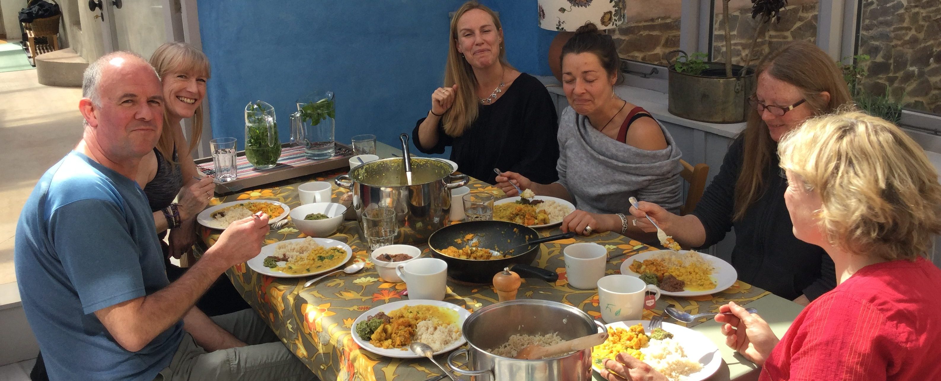 Mangiamo! Let’s eat! Eating together round the big table is at the heart of the retreat community here at Viveka Gardens Yoga Farm. Dhal, rice and subji – and maybe chapatti, but that’s another story – is a meal that will extend to feed all. You don’t want to miss out on chutney with tamarind, and for good measure we added a peamint chutney to this meal too.