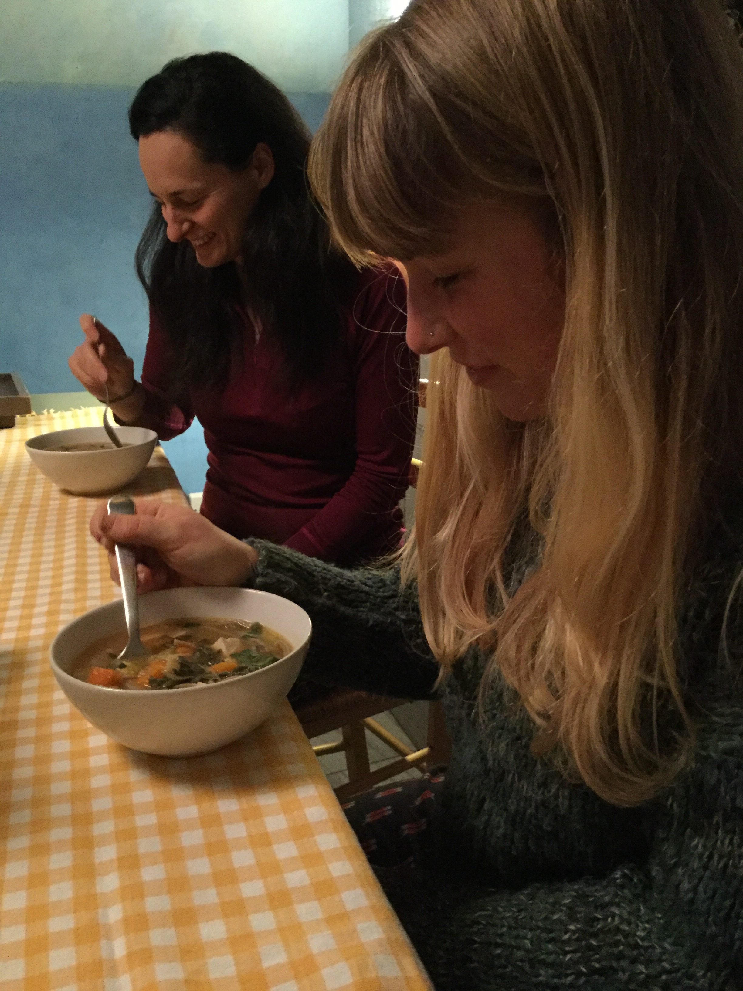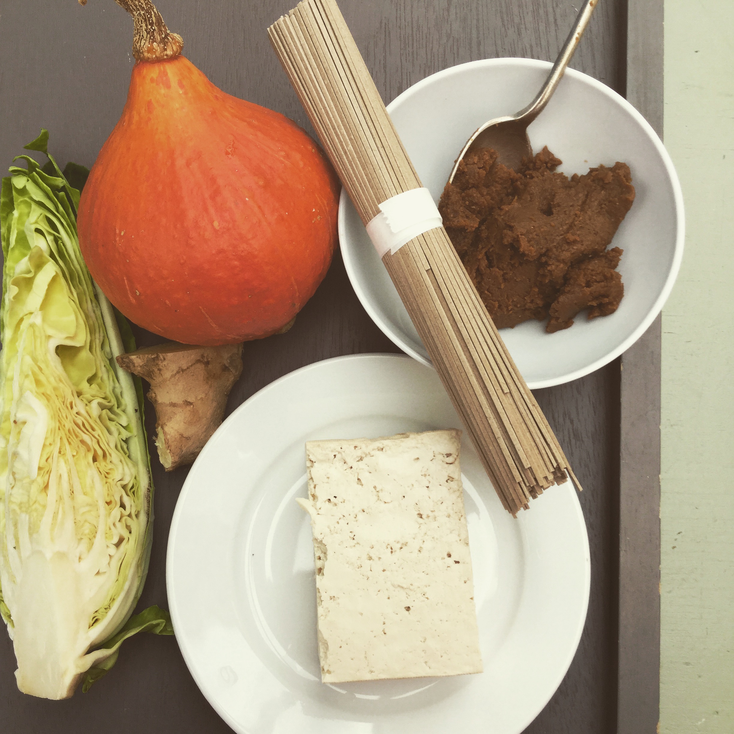 Making use of lovely seasonal squash with this post-class soup, but I didn’t know I knew so much japanese! Uchiki kuri is a top tasty variety and you can eat the skin, so that saves a job. Soba noodles are half buck wheat flour and are slippery, gelatinous down your chin nice. Miso gives umami – yummy – and is very salty. Don’t add extra salt to this. A great rounded, super tasty meal in a bowl.