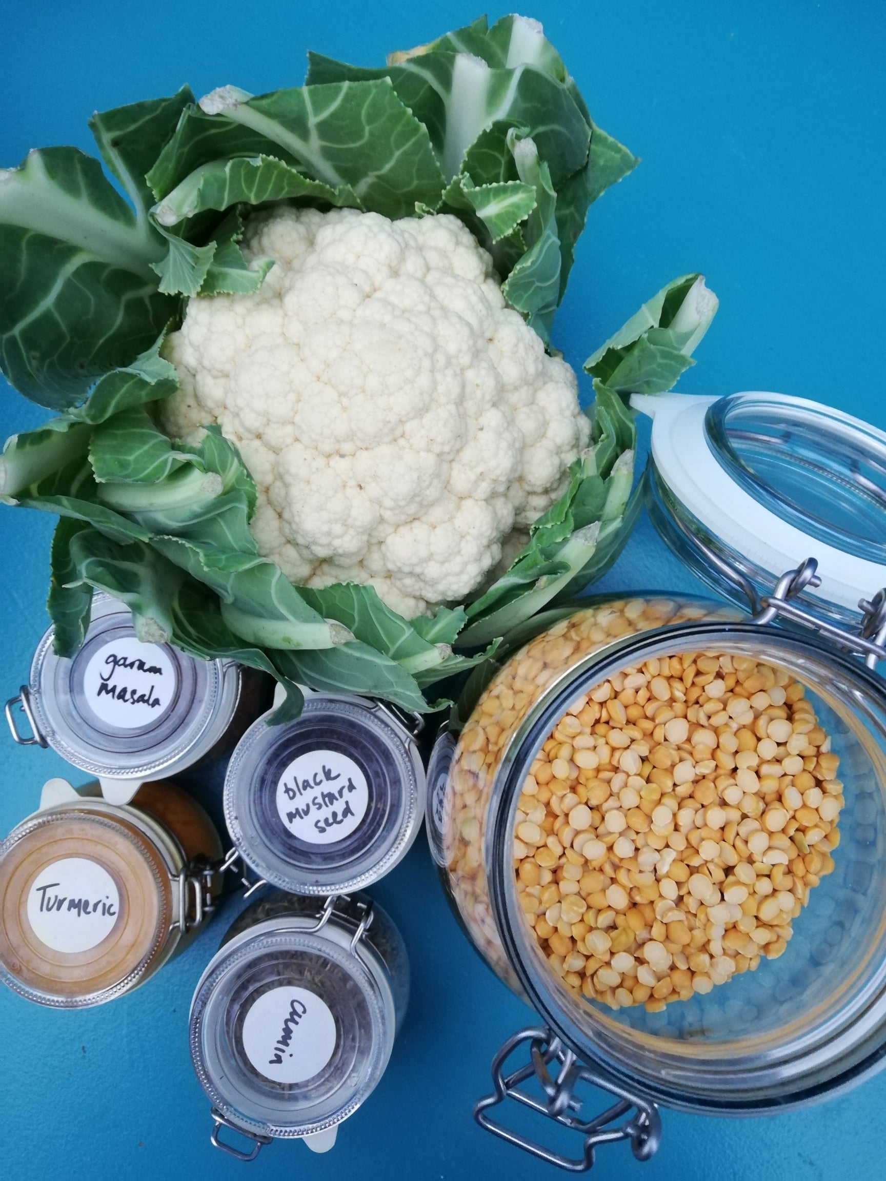 Vegan Souper Soup in many varieties is a key feature after classes and in workshops here at VG. This one is a winter warmer uber-comfort food which is inexpensive when cauliflower is in season and because split yellow peas are readily available in supermarkets and wholefood shops. An organic cauli* costs maybe £1.50 and the amount of peas here 50p. Investing in the spices will cost £4 especially if you head for an ethnic supermarket and these will serve you for other Viveka Gardens dishes.
